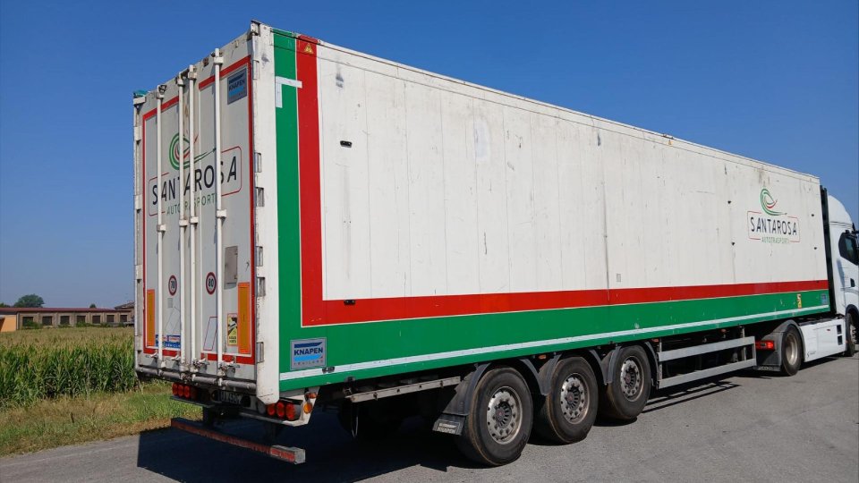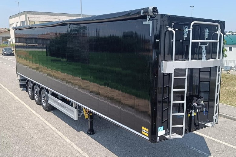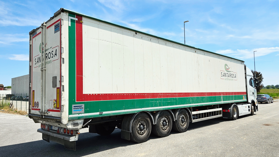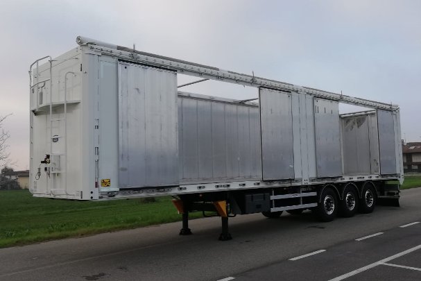 Semirimorchio piano mobile con porte laterali lato SX – 1° asse sollevabile – 3° asse sterzante – freni a disco – nr. 6 cerchi in acciaio – nr. 6 pneumatici 385/65 R 22.5 – telo di copertura manuale – porte posteriori. |