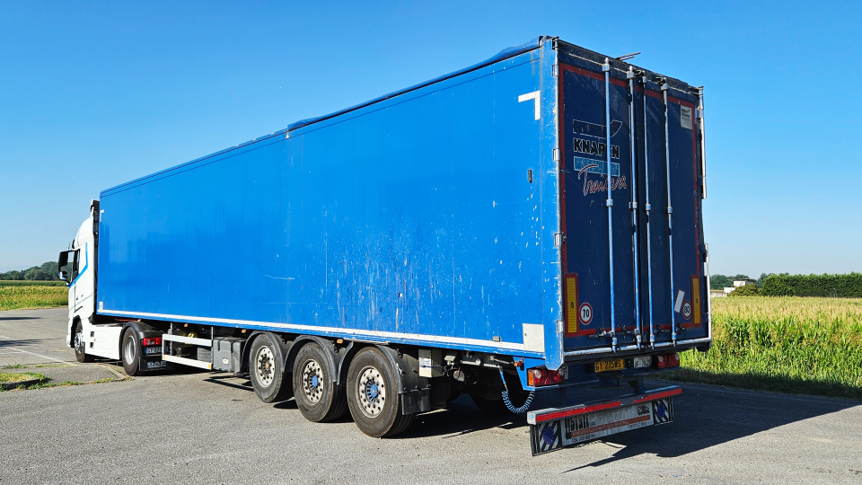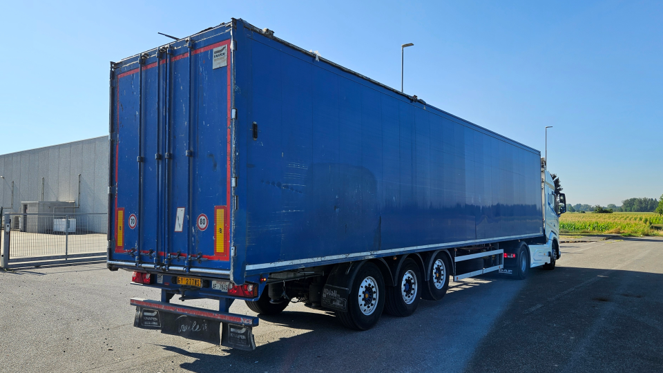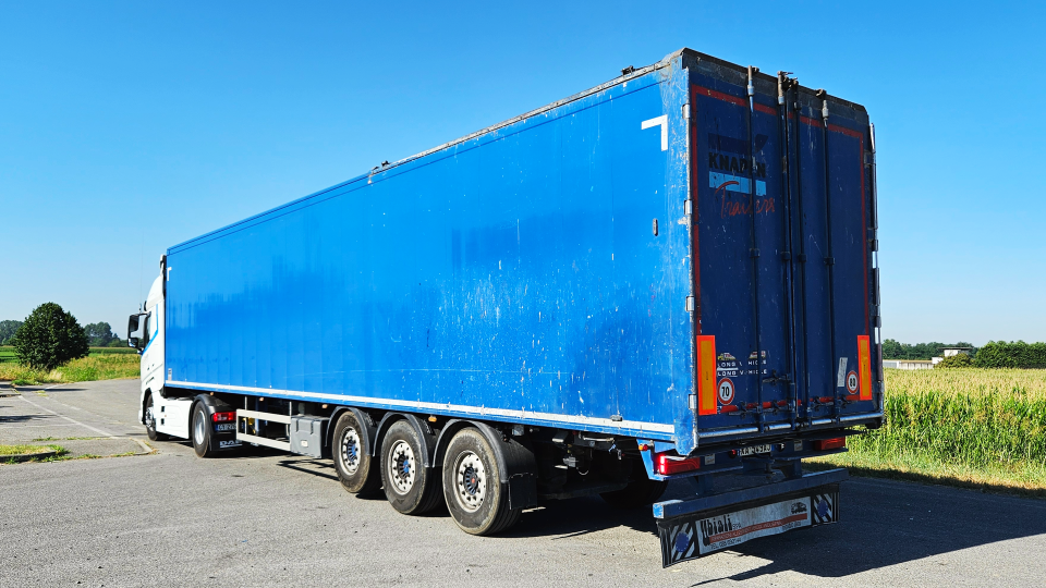 Semirimorchio piano mobile – 3° asse sterzante – freni a disco – telo di copertura tetto nuovo – piano 21 doghe cargo floor 18 / 8 – lamiere di rinforzo nuove applicate alle pareti posteriori. |