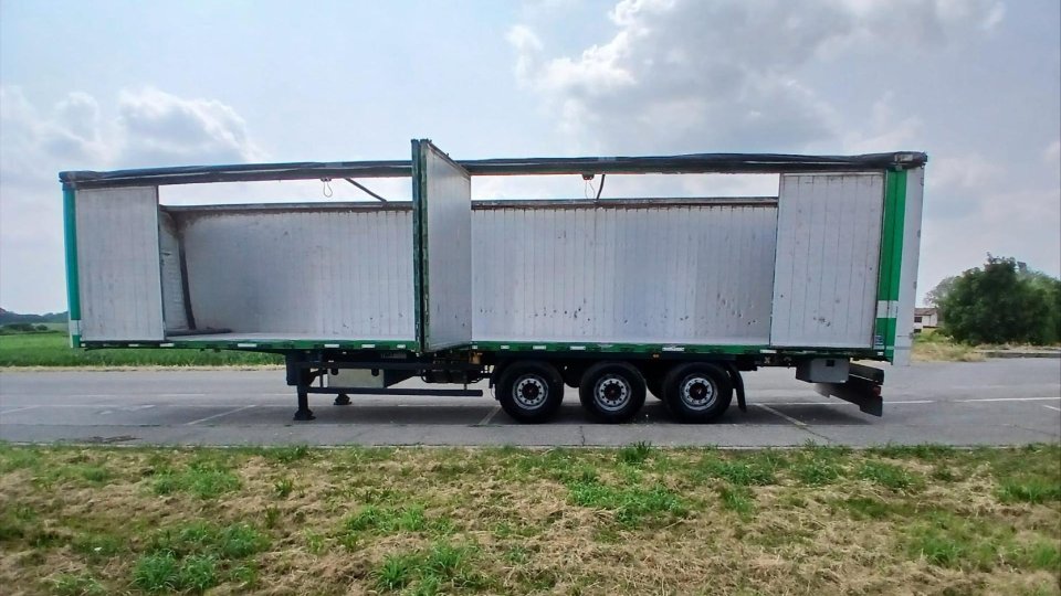 Semirimorchio piano mobile – 1° asse sollevabile – 3° asse sterzante – freni a disco – tetto chiuso per 2/3 + ribaltine manuali – porte posteriori – nr. 6 cerchi – nr. 6 pneumatici. |