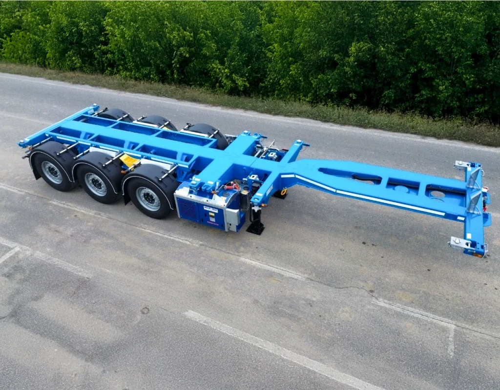 | PORTA CONTAINER D-TEC FLEXITRAILER Il portacontainer estensibile D-Tec della gamma Flexitrailer. L’estensione anteriore e posteriore permette numerose configurazioni di carico container (1×20’ – 1×30’ – 2×20’ – 1×40’ – 1×45’) e casse mobili UIC. |