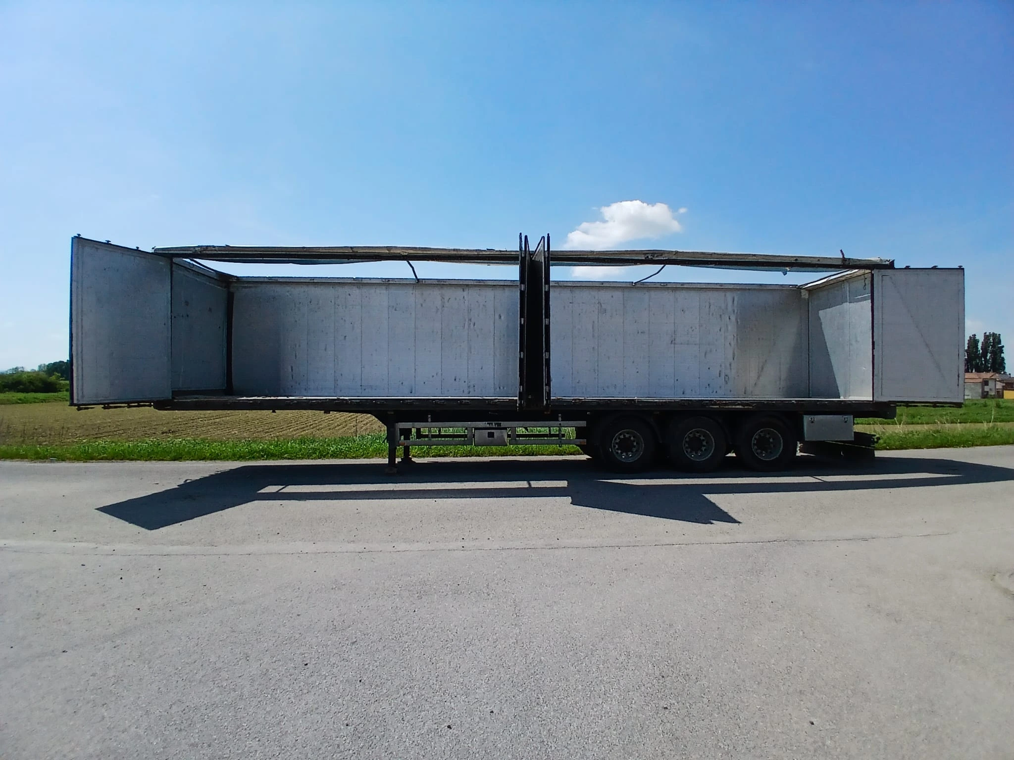 Semirimorchio centinato alla francese – nr. 3 assi fissi – nr. 6 pneumatici 385/65 R. 22.5 – nr. 6 cerchi in ferro – centina alza/abbassa – porte posteriori – tetto copri/scopri – teli laterali scorrevoli.