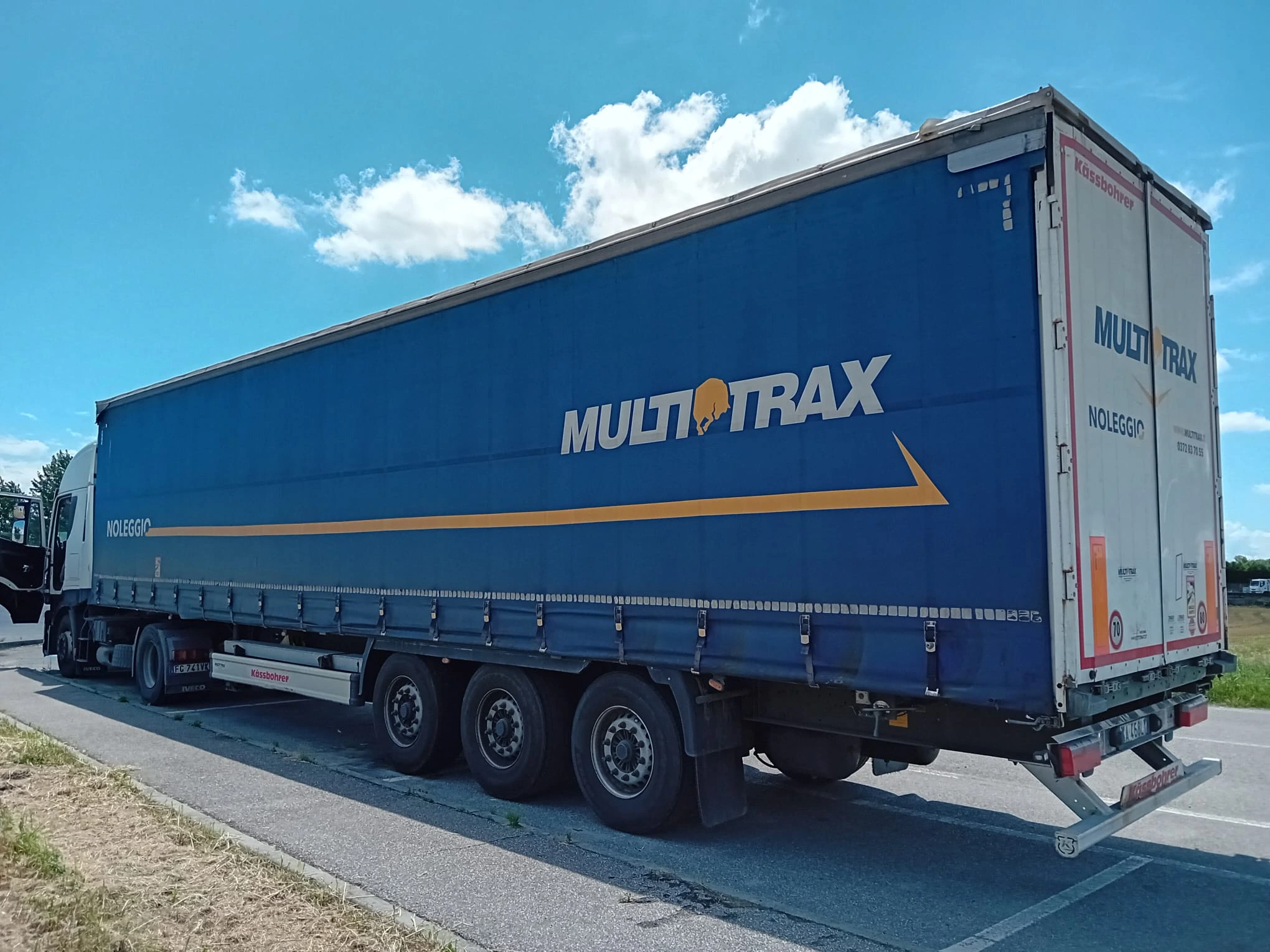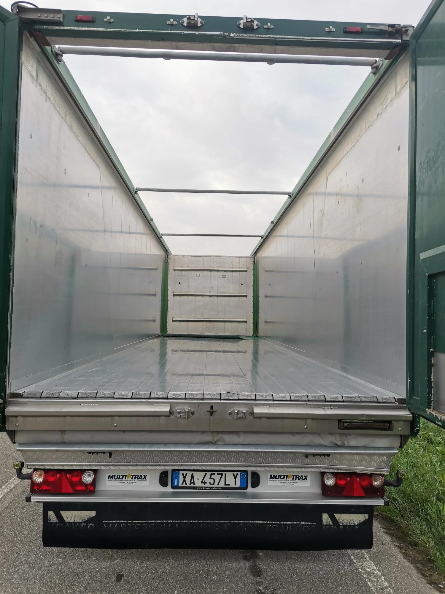 Telaio e cassa in alluminio – capacità 55 mc – 1° asse sollevabile – 3° asse sterzante – freni a disco – nr. 6 cerchi in acciaio – nr. 6 pneumatici 385/65 R.22.5 – sponda basculante / bandiera – telo elettrico “Marcolin” – nr.1 bocchetta cereali – KM PERCORSI: 290.000.