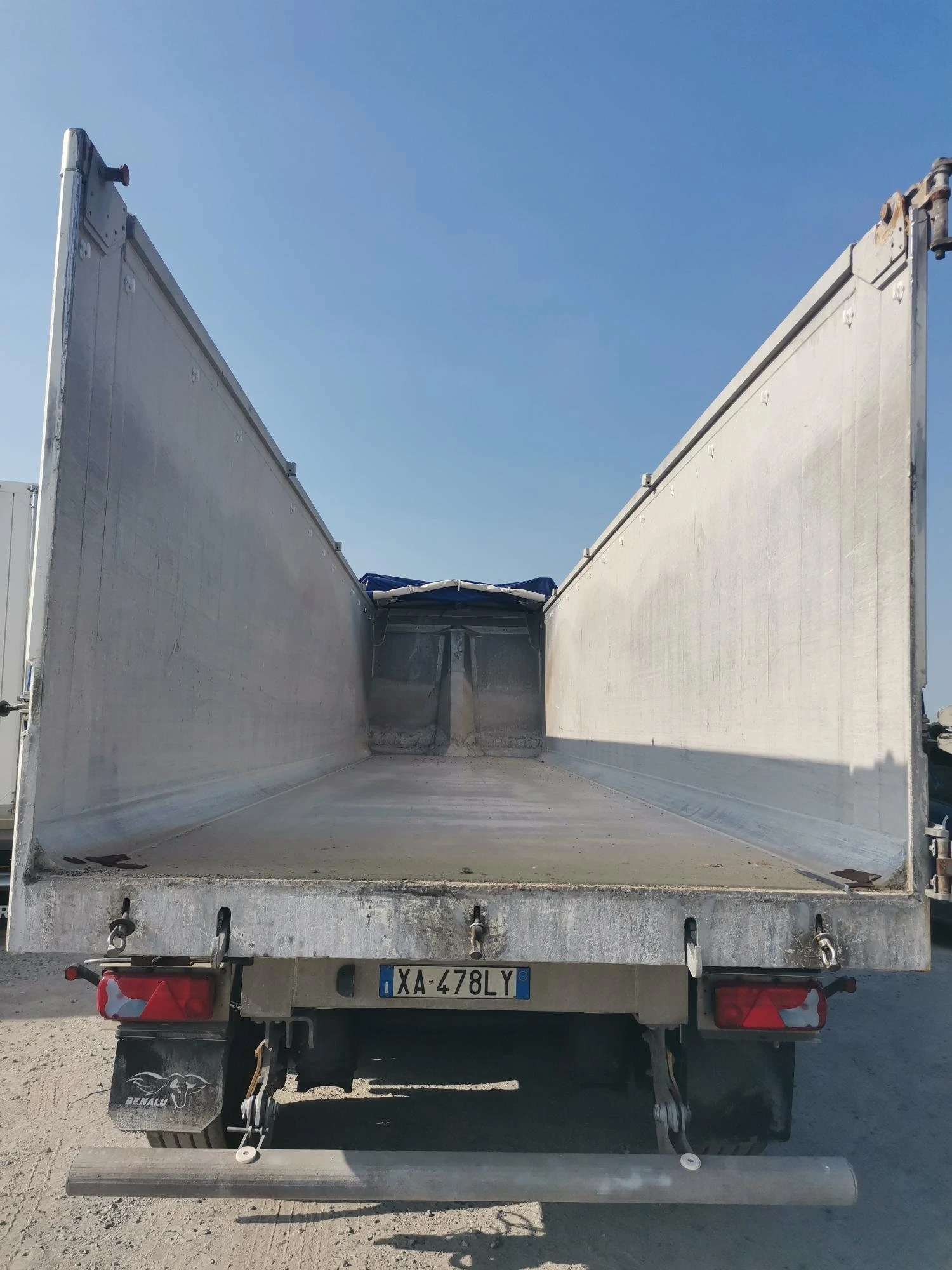 Semirimorchio ribaltabile bilaterale cassa unica – 1° asse sollevabile – 3° asse sterzante – freni a disco – porte posteriori – centina – sponde h 1.100 mm. – nr. 6 cerchi – nr. 6 pneumatici.